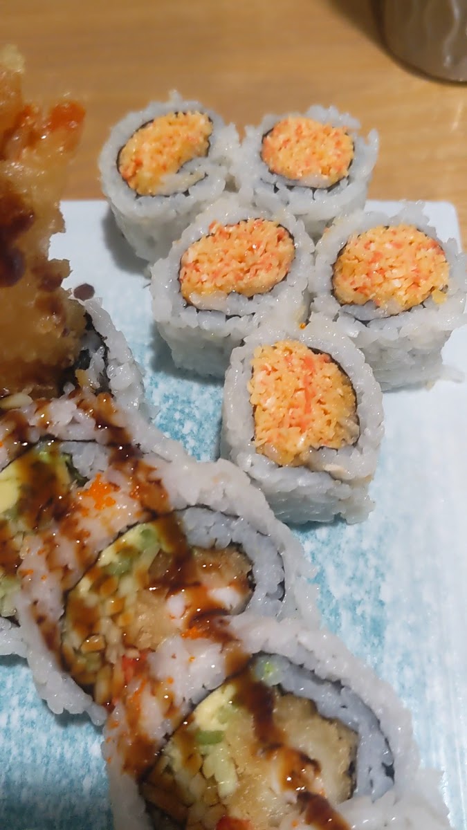 A friend and I dinned in yesterday night, and for a Saturday night it was pretty busy. Despite that, our wait time was about 30 minutes, and the food still came out fairly fast! The rolls were really good (especially compared to You Me Sushi)! My favorite rolls are the Rainbow and Tsukiji. The sashimi and miso soup (not pictured) was a little bland in my opinion, but I'll definitely be back and give it another try. The other sides were pretty good too and for an AYCE restaurant, the steak hibachi was chef's kiss. They also have really cute decor! And even though some of the booths are close by each other it wasn't too loud in the restaurant. Also, shout out to whoever was in charger of the music because they were playing bangers.